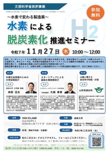 岐阜県エネルギー関連産業コンソーシアムではこのたび、岐阜大学及び中部圏水素・アンモニア社会実装推進会議との共催で「水素による脱炭素化推進セミナー」を開催いたします。
